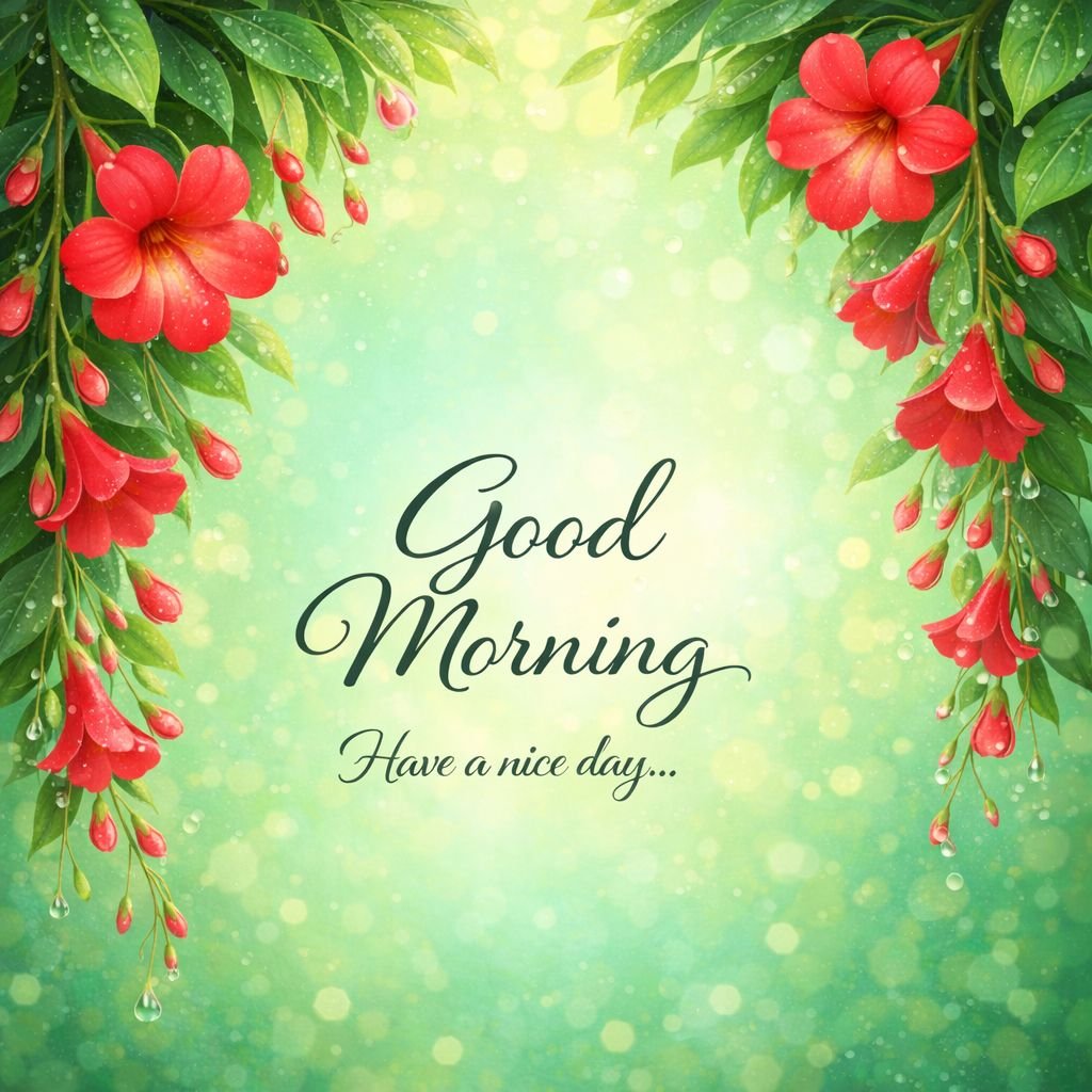 This stunning Good Morning image features vibrant red flowers with fresh green leaves and sparkling water droplets against a soft green bokeh background. The elegant text “Good Morning – Have a nice day” is accompanied by an inspiring quote about every morning being a fresh start. The nature-inspired floral design creates a calm, refreshing, and positive morning atmosphere. Perfect for sharing daily morning greetings with friends, family, and loved ones on WhatsApp, Facebook, Instagram, and other social media platforms. This beautiful Good Morning image spreads motivation, happiness, and encouragement to begin the day with energy and a positive mindset.