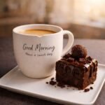 Enjoy a cozy start to your day with this beautiful Good Morning coffee and chocolate cake image. Featuring a warm cup of coffee with a sweet message and a delicious chocolate dessert, this image perfectly captures a relaxing and happy morning vibe.